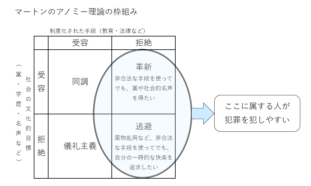 これは、社会の仕組みが犯罪を生んでいるのではないか?という研究です。「誰でもわかる」シリーズの入門書で最初に紹介されたのが、マートンの「アノミー(無規範)理論」です。これは、その社会で平均的な価値観や社会ルールにどの程度同意してるか反抗しているか(無規範状態か)で、「田の字」をつくり、それぞれの領域の特徴を考えたものです。