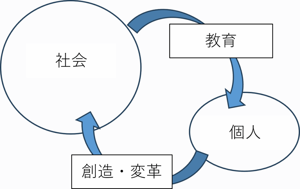 つまり人間は、親や社会の教育を受けつつも、自分なりにそれを理解して新しい考えを付け加え、環境の変化に応じて社会を作り変えながら生きてきたのです。この事実を見ると「個人と社会は循環関係にある」と言わなければなりません。実際に生活していると「個人は社会に縛られている」と感じることがほとんどです。でも、実際には、その息苦しい社会を手直しすることで人類は生き延びてきたのでした。